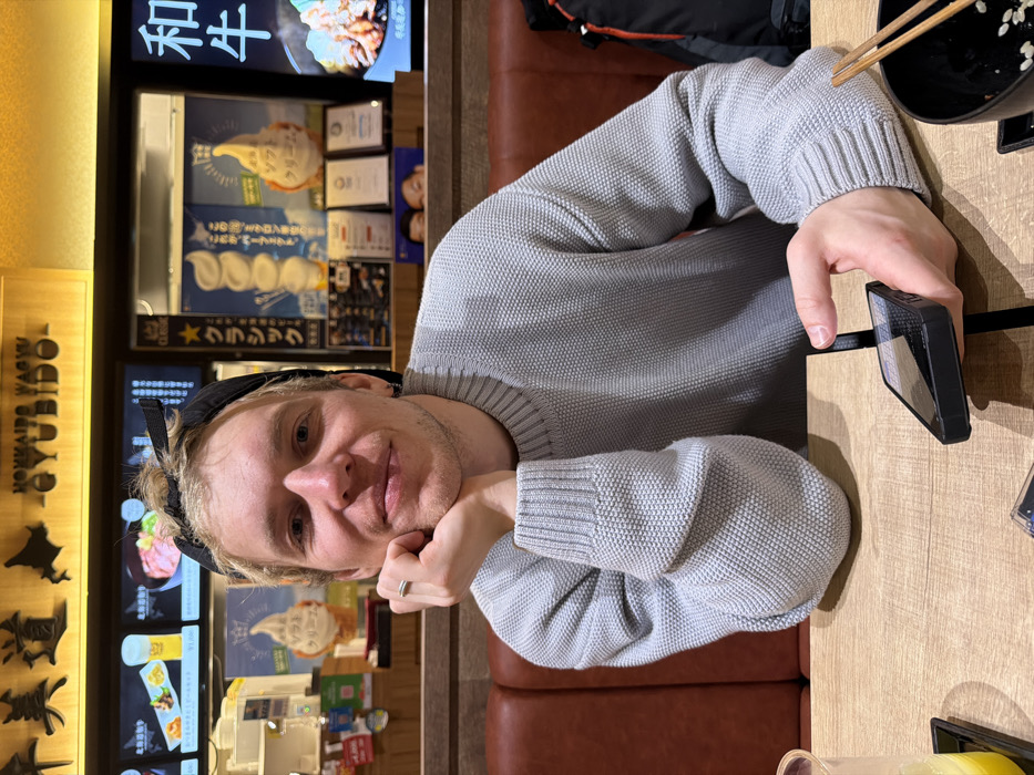 A male individual is seated at a wooden table inside the Hokkaido Wagyu Gyubido restaurant, located within New Chitose Airport in Chitose, Japan. The man, exhibiting light-colored hair partially tied back by a black bandana, wears a light grey textured knit sweater. He is positioned centrally, facing forward with a faint smile. His left hand, wearing a silver ring on the ring finger, supports his chin. His right hand holds a black smartphone. On the table, to the left, is a clear cup containing a yellow liquid. To the right, a black bowl with wooden chopsticks and residual food is present. The background features red upholstered booth seating and illuminated restaurant signage displaying Japanese text and images of food items, including soft-serve ice cream. Two small faces are discernible peeking over a menu display in the background. A portion of a black backpack is visible to the right of the seated individual.