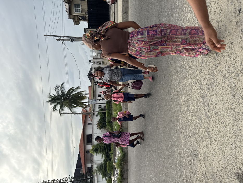 The image depicts a street scene in Badore, Nigeria, under an overcast sky, with multiple pedestrians in motion on an asphalt roadway. In the immediate foreground, a dark-skinned arm and open hand extend from the bottom right. The central view includes a woman walking away from the viewer, wearing a brown top, a multi-patterned skirt in shades of pink and purple, and a patterned headscarf, holding a light-colored smartphone. Adjacent to her and positioned further left, another woman in a grey patterned top and blue jeans carries a dark purple bag and holds the hand of a young boy. This boy wears a pink school uniform with a tie, blue shorts, and carries a pink backpack. He is holding hands with a younger child, also in a dark blue uniform with a pink backpack. To their left, a woman in a pink patterned dress and flip-flops walks, carrying a small dark bag, with another child partially obscured behind her. The background features light-colored buildings with red roofs, surrounded by white walls and green foliage, including a tall palm tree and utility poles with overhead wires. A partial view of a dark vehicle is visible on the far right.