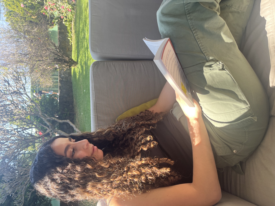 - "A woman reclines on a gray outdoor couch, engrossed in a book" by FM-u1XXD2, licensed under CC BY 4.0