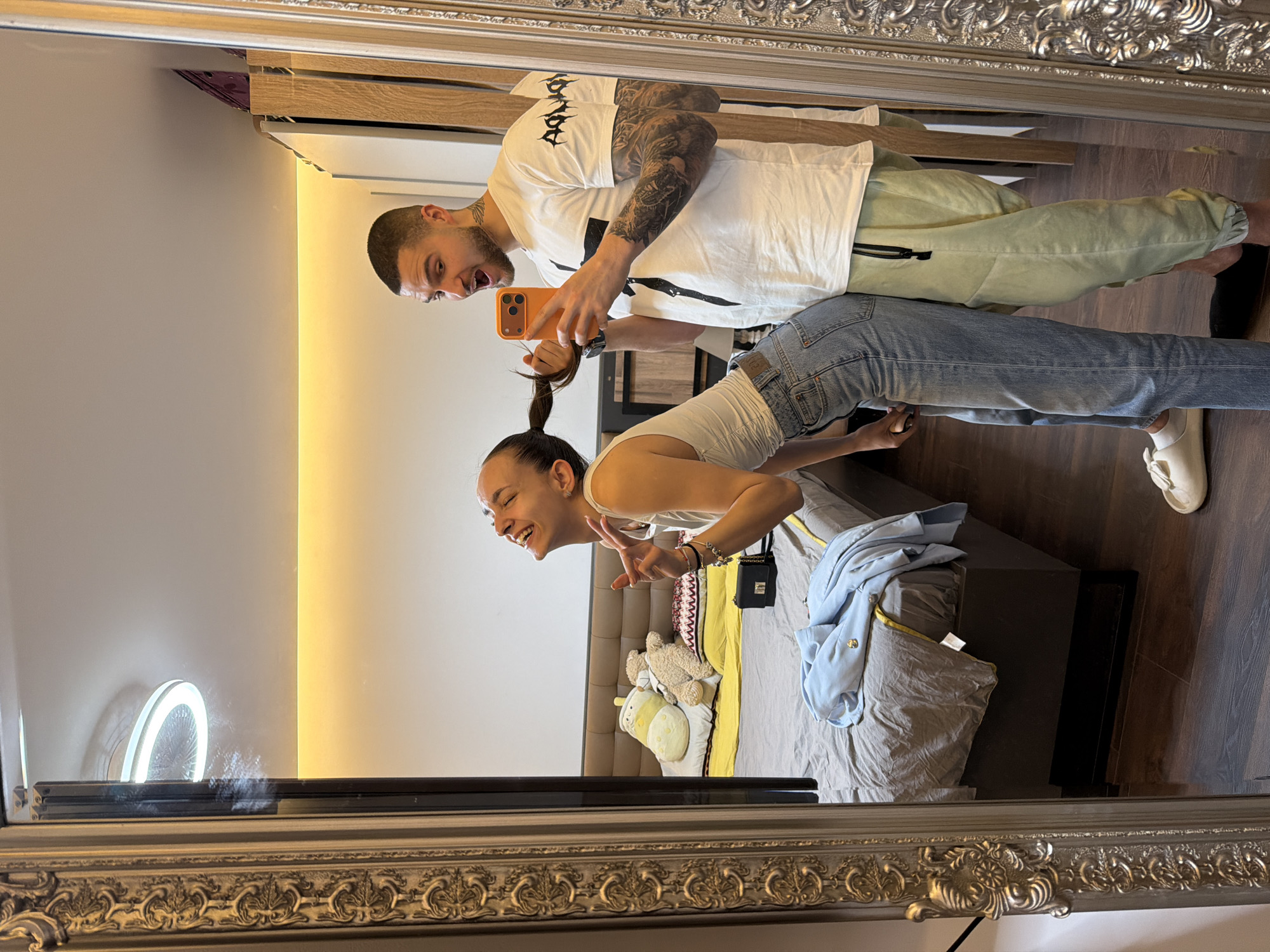 The image depicts two individuals reflected in a large, ornate silver-framed mirror within what appears to be a residential bedroom in Sofia, Bulgaria. **Subjects:** 1. A female individual, positioned on the right side of the frame, is seen from the chest up, facing left with her head tilted back, laughing. She wears a white sleeveless top, light blue jeans, and white flat shoes. Her dark hair is pulled into a ponytail. She has multiple bracelets on her left wrist, and her right hand is raised, making a 'peace' gesture. 2. A male individual stands behind and to the left of the female, facing forward into the mirror while holding an orange-cased smartphone to take the photograph. He has a short buzz cut, a beard, and extensive tattoos on his arms, neck, and chest. He wears a white t-shirt with a black cross design and the word "AQUILA" (reversed) on the sleeve, and light green sweatpants. His mouth is open as if yelling or expressing surprise. His left hand holds the female's ponytail. **Actions/Interactions:** The male is actively holding the female's ponytail, while the female reacts with laughter. The male is taking a mirror selfie using his smartphone. **Environment:** * The room features dark brown wooden flooring and light-colored walls. * A large bed with a padded, brown upholstered headboard is visible behind the individuals. The bed is dressed with a grey duvet, yellow sheets, and multiple pillows, including two plush animal-shaped pillows (one yellow, one brown bear). * A small black handbag and a light blue jacket are casually placed on the bed. * The ceiling features a modern circular LED light fixture and a linear strip light providing warm illumination along the back wall. * A portion of a light-colored wardrobe or cabinet is reflected on the far right side of the mirror.