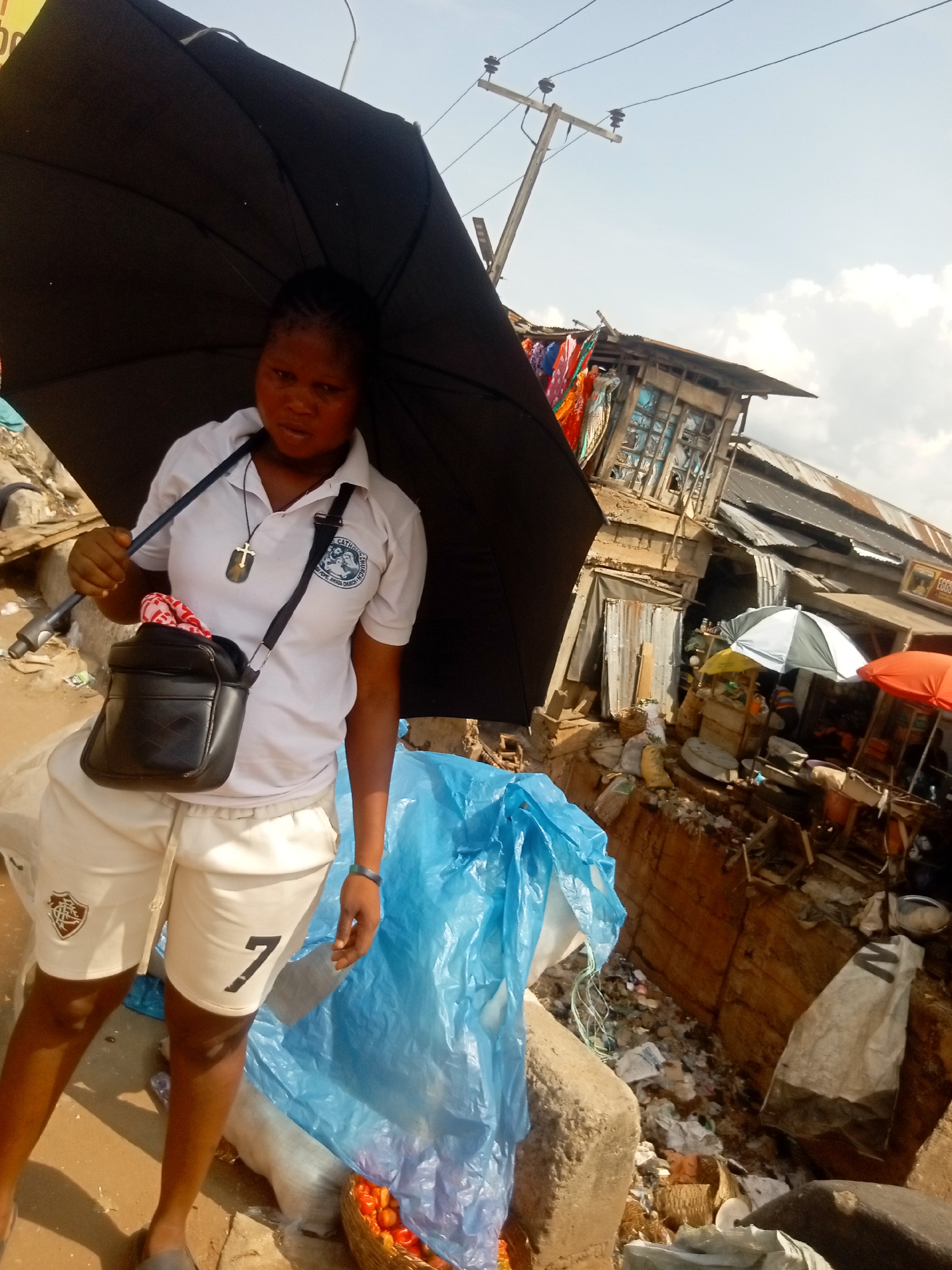 An individual stands on an unpaved surface in a market or commercial area of Onitsha, Nigeria. The person, appearing young and of dark complexion with short dark braided hair, wears a white short-sleeved polo shirt with a "ST. CATHOLIC CHURCH ONITSHA ARCH DIOCESE" emblem on the left chest and a dark cross pendant around their neck. They wear light-colored shorts, featuring an emblem on the left leg and a black number "7" on the right leg, along with dark slippers. In their left hand, they hold an open black umbrella overhead, angled towards the left. A black shoulder bag with a textured flap is worn across their body, revealing a red and white patterned cloth inside. A blue wristband is visible on their right wrist. The background features a dilapidated multi-story structure constructed from wood and corrugated metal, with broken windows and colorful fabrics hanging outside, suggesting a textile stall. A wooden utility pole with power lines extends towards a partly cloudy sky. To the right, further market stalls are visible with small shade umbrellas (one white/grey, one orange/red), and a partial sign reading "EDGE" is discernible. The immediate foreground and midground consist of rough, uneven ground, large rocks or concrete blocks, and a spread blue tarp. A woven basket containing red tomatoes sits on the ground near the person's feet. To the right, a significant earthen ditch or drop-off is visible, filled with various refuse, including plastic bags and a large white sack with the letter "N" printed on it.
