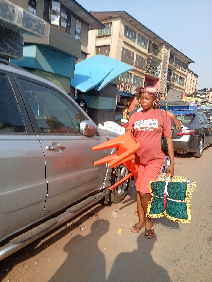 A woman is carrying an orange chair and a green cushion on a street