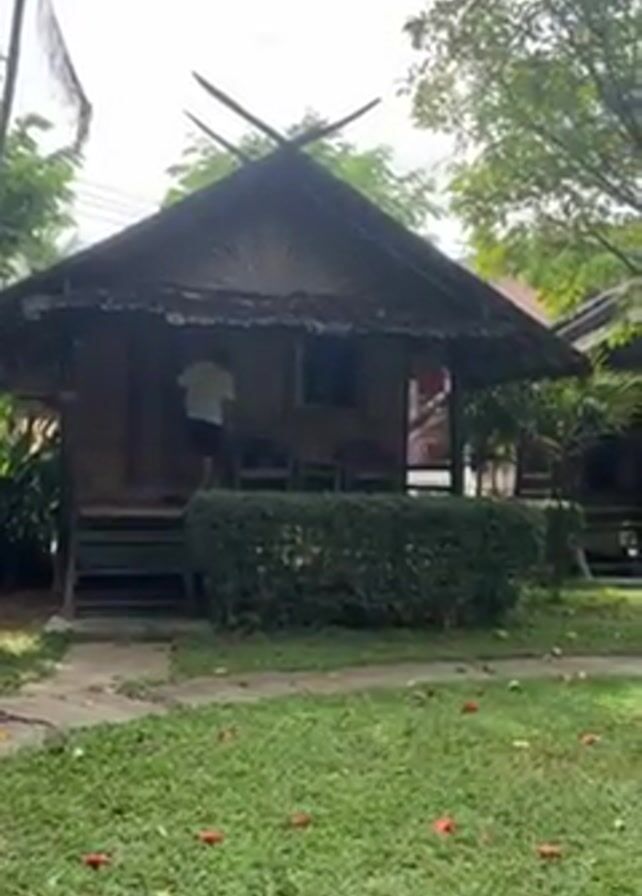 series of small wooden bungalows on a grassy lawn, with trees scattered throughout the area. The bungalows appear to have thatched roofs and small porches with chairs. In the first shot, a person wearing a yellow shirt and dark shorts is seen entering one of the bungalows. The camera then pans across the lawn, showing several similar bungalows and trees in the background. There are also some red flowers scattered on the grass.