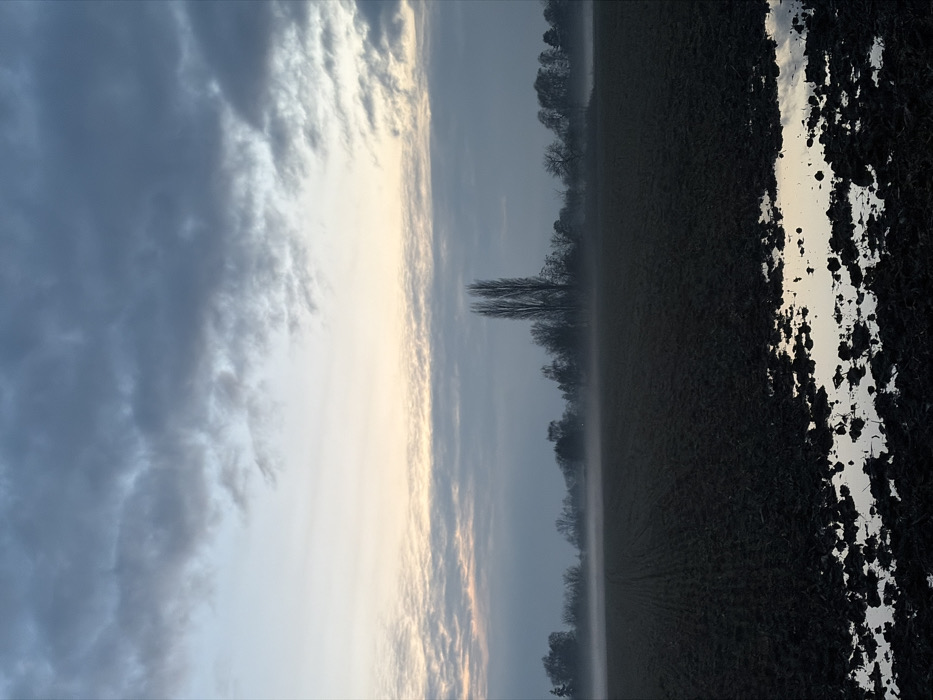 A landscape photograph, rotated 90 degrees, captures a field under a cloudy sky. Trees line the horizon, obscured by mist. The right side of the frame shows muddy ground, partially reflecting the light. The sky transitions from dark, textured clouds on the left to a softer, brighter area near the center, suggesting sunrise or sunset. The overall scene conveys a sense of tranquility and rural stillness.