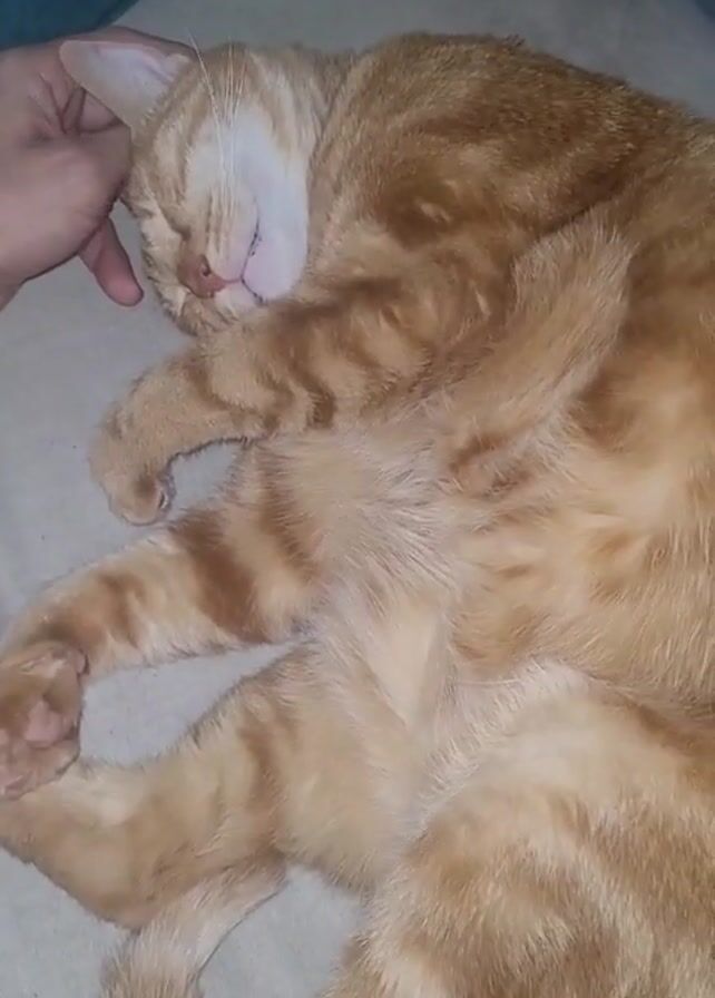 - "A hand is seen gently touching the head of an orange tabby cat as it sleeps" by FM-lpZ3r2, licensed under CC BY 4.0