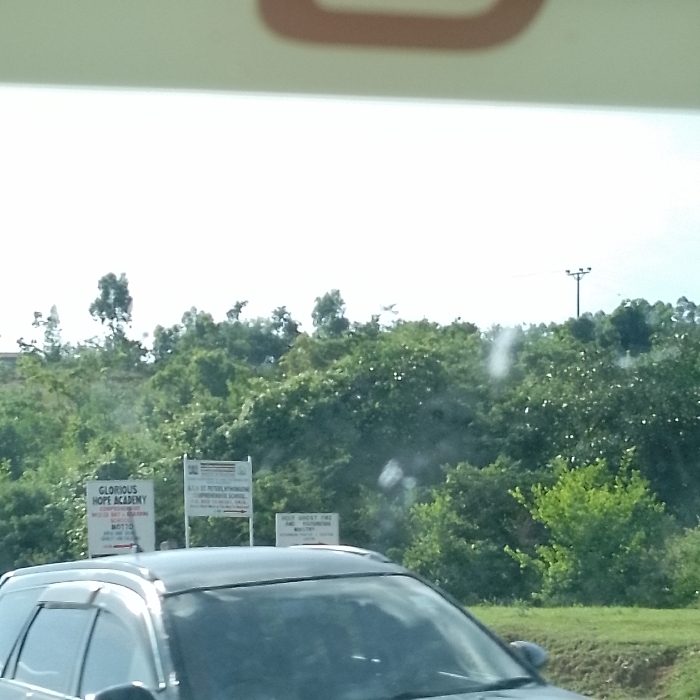 The image depicts an outdoor scene in Kola ward, Kenya, viewed from the interior of a vehicle during daylight hours. The lower third of the frame shows the dark-colored hood, windshield, and roofline of a car. Above the vehicle, a grassy bank with scattered foliage rises, featuring three vertically oriented signs. The leftmost sign, white with dark text, reads "GLORIOUS HOPE ACADEMY." The central sign, also white, indicates "A.I.C ST. PETER'S... KOLA WARD," confirming the location. The rightmost sign, partially obscured, displays "HOLY GHOST FIRE AND... MINISTRY." Beyond the signs, a dense green landscape of trees and bushes extends, forming a natural backdrop. On the far right, a dark utility pole with cross arms stands against a bright, hazy, or overcast sky that occupies the upper portion of the image. No individuals are visible.