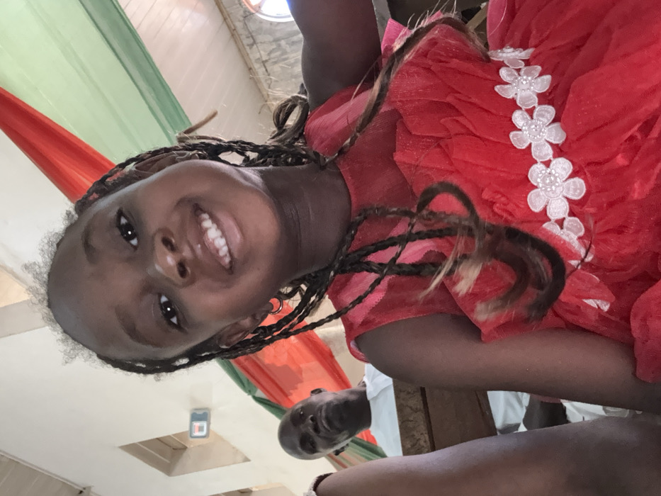 An indoor, eye-level photograph captures a young Black girl, approximately 5-7 years old, positioned prominently in the foreground, facing directly towards the camera with a wide smile revealing her teeth