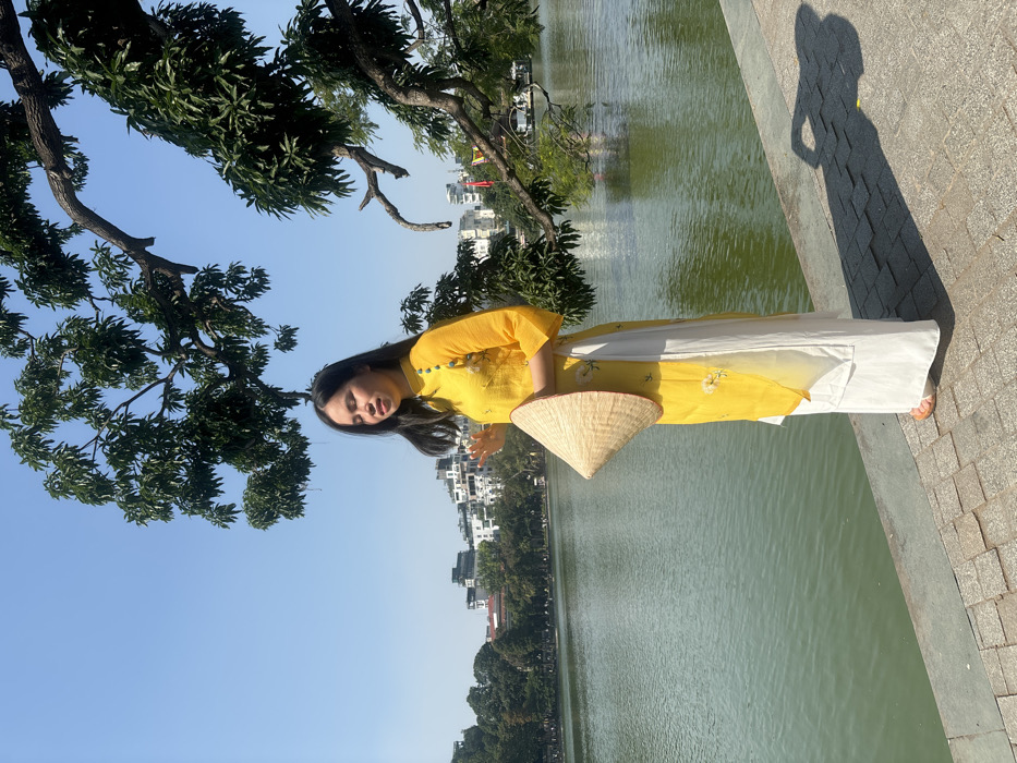 A woman in a traditional yellow dress and white pants poses outdoors, holding a conical Asian hat. She stands next to a body of water, possibly a lake, with trees lining the opposite shore and buildings visible in the distance. A tree branch overhangs the scene from the upper left. The woman's shadow is cast on the walkway beside the water. The overall setting appears to be a park or scenic area in a city.