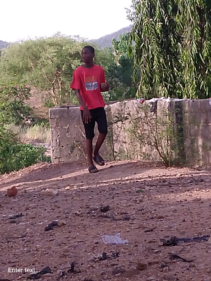 A full-body shot shows a young man standing on a rocky, dirt-covered ground with scattered trash. He wears a red t-shirt, black shorts, and sandals. Behind him is a low, weathered concrete wall with plants growing nearby. Trees and distant hills are visible in the background. The location appears to be in a somewhat rural or undeveloped area, with sparse vegetation and an unpaved surface.