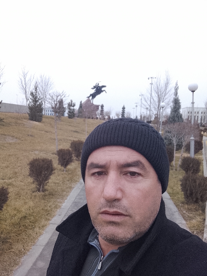 A man wearing a black beanie and coat stands on a path, taking a selfie