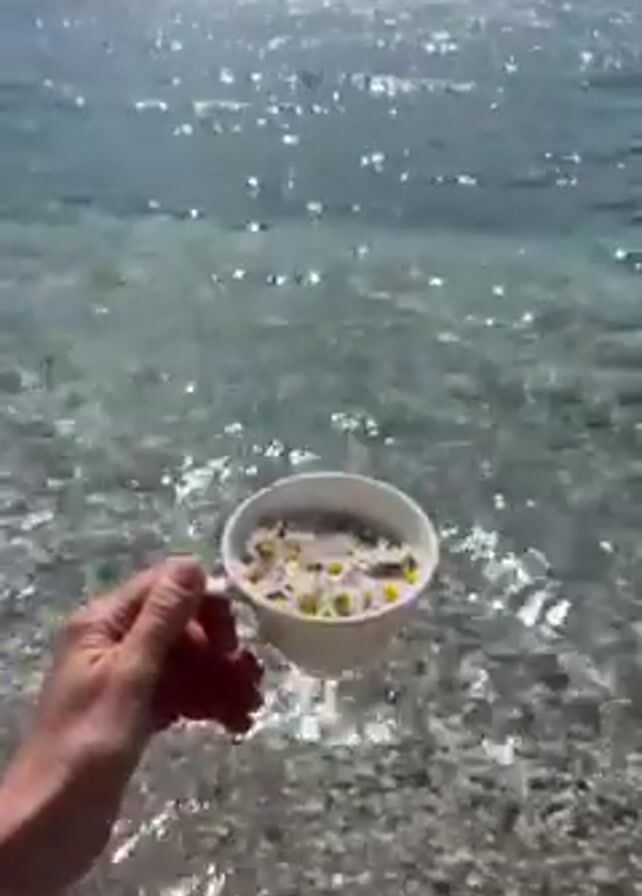 . The video depicts a person's hand holding a white teacup filled with water and small daisy-like flowers. The background shows a body of water, possibly a sea or ocean, with sunlight reflecting on the surface creating a sparkling effect. The water appears clear and shallow near the shore. In the distance, there is an island or landmass with some vegetation. The overall scene suggests a tranquil and natural setting.