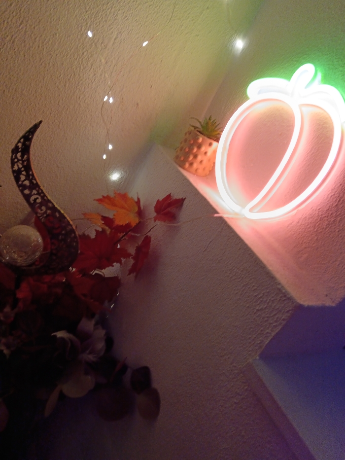 The scene depicts an interior corner of a room in Toulouse, France, arranged with various decorative elements under artificial lighting. On an elevated, light-colored, textured shelf in the upper right, a white neon sign, shaped like a stylized peach or apple, emits a prominent pinkish-white glow. This light casts a pink illumination onto the textured wall directly behind and above the sign, and a subtle green hue is visible on the wall to its left. Positioned to the left and slightly behind the neon sign, on the same shelf, is a small succulent plant housed in a textured, light-colored pot. Descending vertically along the textured wall in the upper left quadrant are a series of small, bright white LED string lights. In the lower-left foreground, a dark, curved, intricately patterned decorative object, possibly metal, stands partially visible, with a clear spherical element at its base. Adjacent to this object, a cluster of artificial autumn leaves, predominantly red and orange, is displayed, interspersed with darker foliage. Additional indistinct foliage is visible further in the lower left. The overall lighting is dim and warm, characterized by the distinct light sources. No individuals are present.