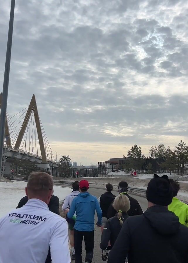 A group of approximately 10 people are jogging on a paved path near a road. The camera perspective is initially from behind the group, following their movement. Some are wearing running gear. One person in the front wears a white top with "УРАЛХИМ RUNFACTORY" printed on the back. In the background, there is a large bridge with two tall, triangular pylons. The sky is overcast with patterned clouds. The camera then moves in front of the joggers, capturing their faces. Some wear sunglasses. The surrounding environment consists of trees and some remaining patches of snow.