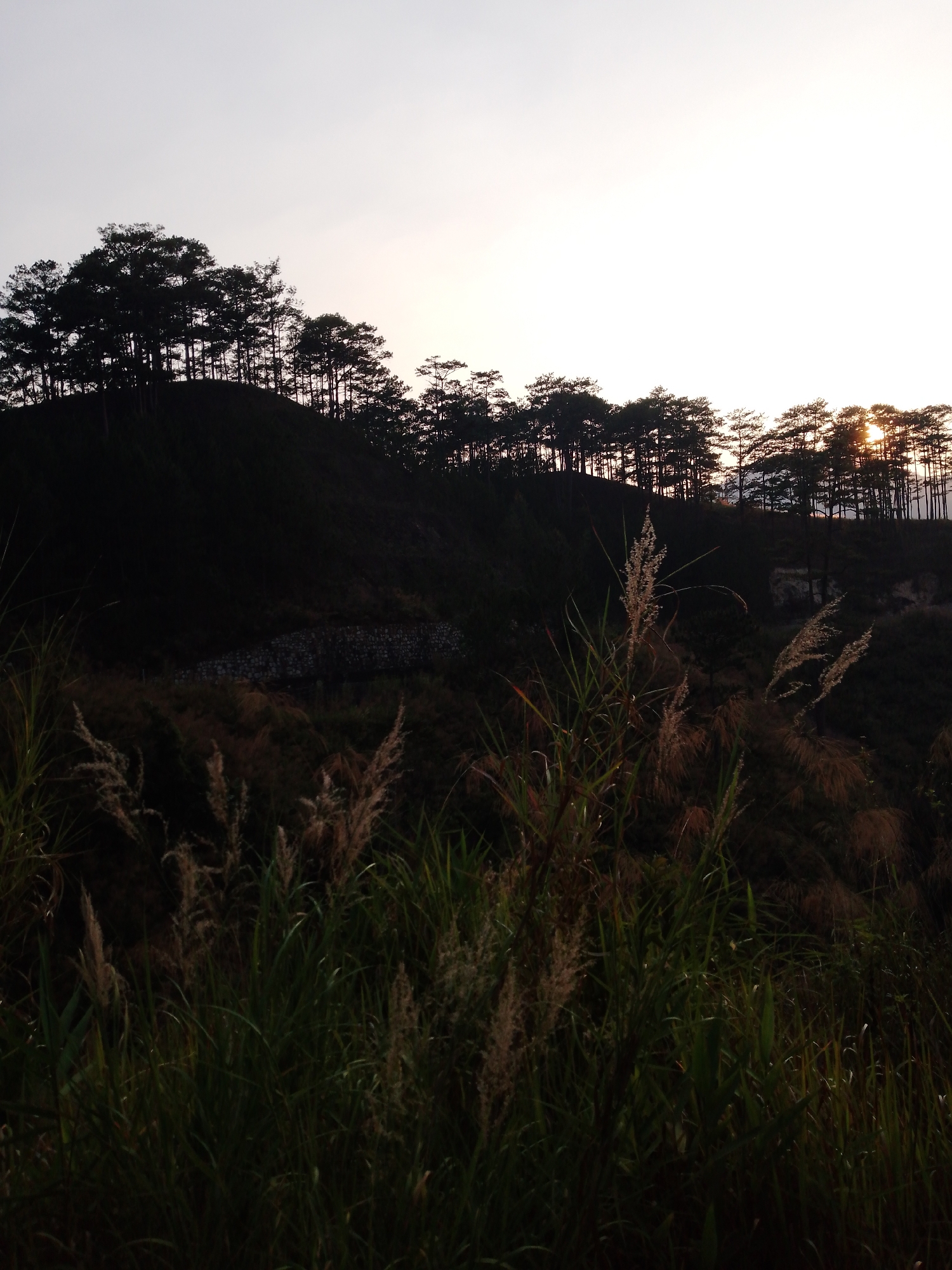 This image displays a natural landscape at either dawn or dusk, located in the city of Unknown, Unknown. A prominent, dark hillside occupies the middle and background, silhouetted against a pale, bright sky. The crest of the hill is densely forested with numerous tall, slender coniferous trees, through which the sun's warm light is partially visible on the far right. The lower slopes of the hill are heavily shadowed, with a dark, terraced rock formation discernible on the left side of the slope. The foreground is filled with tall grasses and other wild vegetation, largely appearing in shadow, with some lighter-colored, dried plant stalks evident. No individuals, animals, or direct human activity are depicted within the scene.