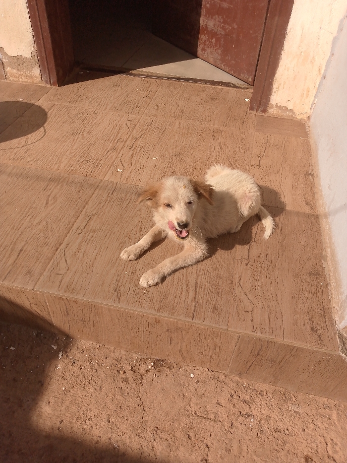 A cream and light brown dog is depicted lying on a light brown tiled surface with a textured, wood-grain pattern. The dog's mouth is open, and its pink tongue is visible, slightly extended. Its front paws are outstretched. The tiled area forms a step down to a reddish-brown dirt ground in the lower left and bottom portions of the frame. In the background, a dark brown door, partially ajar, reveals a dimly lit interior. To the right of the door frame, a light-colored wall exhibits signs of wear and chipping. Direct sunlight illuminates the scene from the left, casting a shadow in the lower left corner. The scene is an outdoor entrance area in the city of Unknown, Unknown.