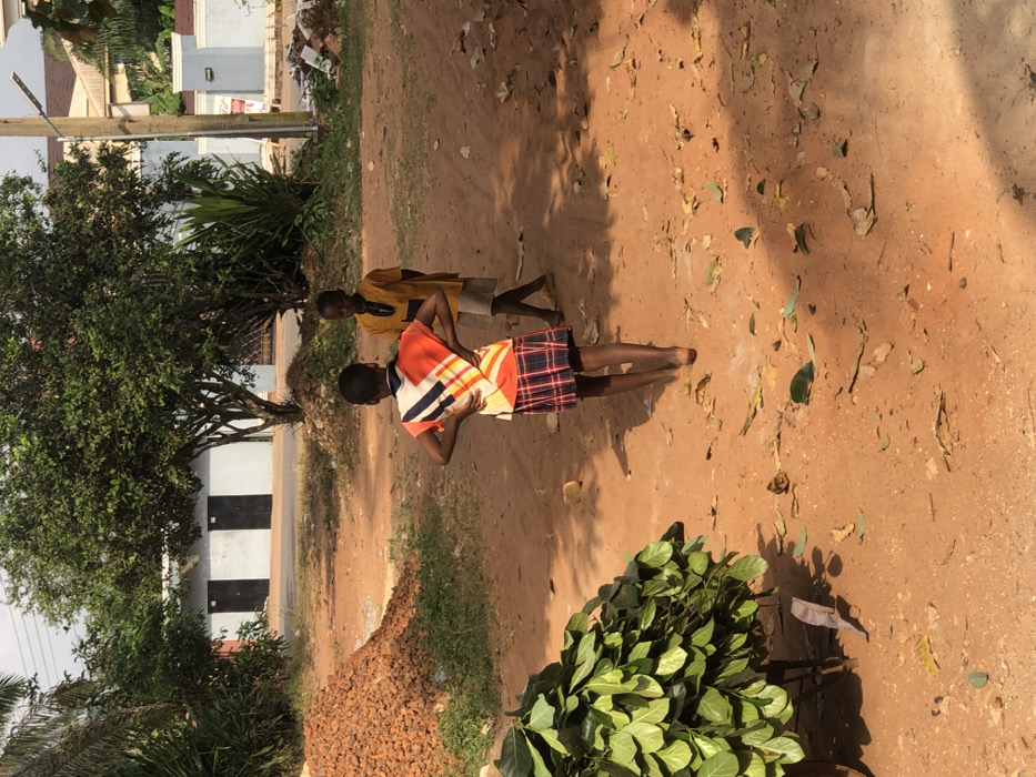 The image captures an outdoor scene in Alor, Nigeria, under direct sunlight. Two young individuals stand on an unpaved, reddish-brown dirt path scattered with dry leaves and small debris. In the foreground, a child is observed from behind, barefoot, wearing a sleeveless top with an orange, white, blue, and black geometric pattern over a red and blue plaid skirt, with hands placed on their hips. Approximately two meters behind and to the right, another barefoot child stands, facing the first, wearing a yellow short-sleeve collared shirt with dark patterns and light-colored shorts. To the immediate left foreground, a partially visible two-wheeled cart holds a large pile of dense green leaves. Further into the mid-ground on the left, a substantial pile of reddish-brown rubble is present. The background features a light blue building with two dark, rectangular doors. Dense green foliage from various trees and bushes is distributed across the mid-ground and background. A utility pole with a street light fixture is visible on the right side of the background. Shadows are cast distinctly on the ground, indicating clear, bright weather.