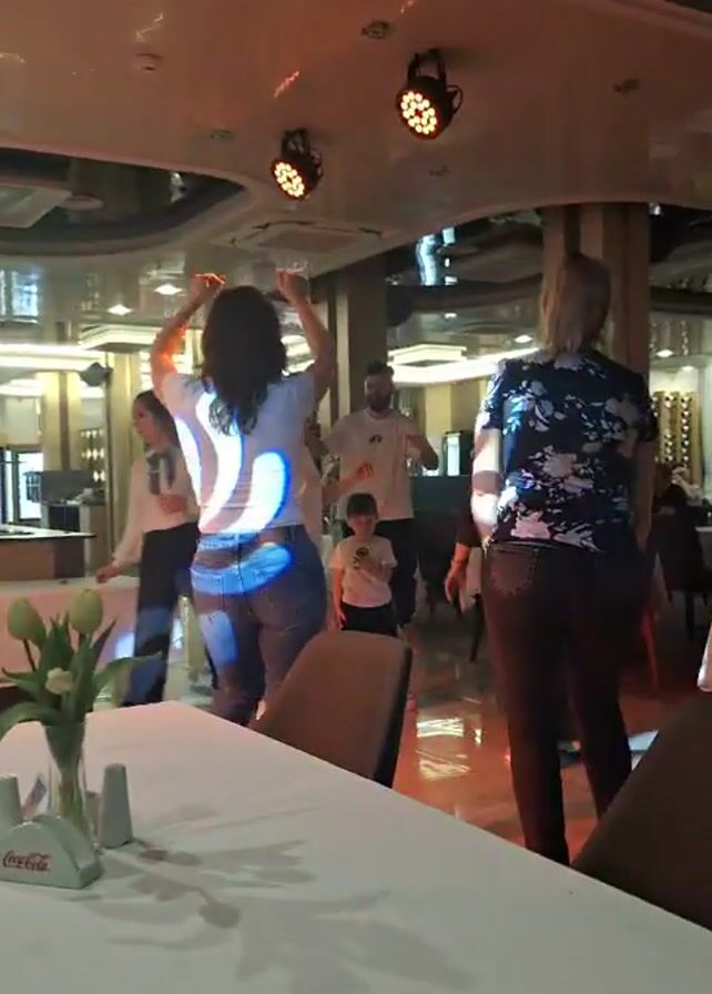 group of people dancing in a restaurant, including a woman with dark curly hair, wearing jeans and a white top, and a woman with blond hair, wearing a black floral shirt and black pants. A man with a beard and a little boy are also present, along with other people who are out of focus in the background. The scene is illuminated by colored lights that change between red, green, and blue. There are tables with white tablecloths and centerpieces with flowers in the foreground. The restaurant has an open layout with buffet-style food stations in the background.