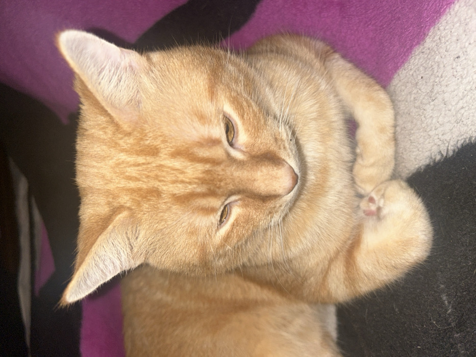 - "An orange tabby cat lies on a blanket with pink and black sections" by FM-ZvYlO2, licensed under CC BY 4.0