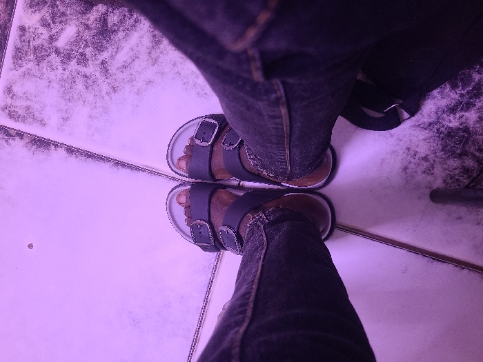 The image displays a high-angle view of a person's lower legs and feet standing on a tiled floor. The individual is wearing dark blue or black denim jeans and dark grey or black sandals, each secured by two silver-colored buckles, with visible light brown footbeds and white sole edges. The exposed skin on the feet exhibits a dark complexion. The floor is composed of large, light-colored square tiles separated by dark grout lines. A section of the tiled floor on the right side of the frame exhibits significant dark discoloration or accumulated debris, presenting a textured appearance. The entire scene is illuminated with a strong purple or magenta ambient light. A dark strap is partially visible on the lower right, adjacent to the right leg, and a dark cylindrical object is partially visible at the bottom center of the frame. Visual information within the image does not specify a precise location within Markurdi, Nigeria.