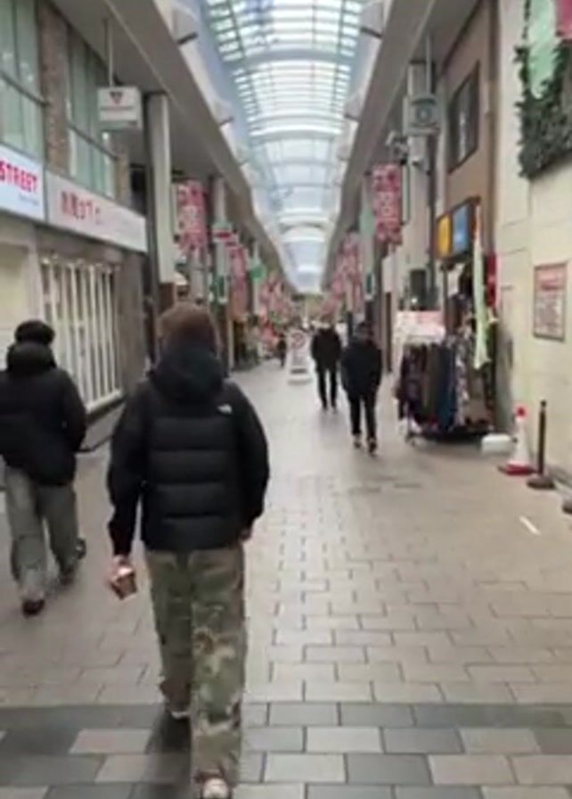 person walking through a covered shopping arcade. The arcade has a high, glass-paneled roof allowing natural light to filter through. Numerous shops line both sides of the walkway. Red and pink decorative banners hang overhead. Several people are walking in both directions. The person recording the video is walking forward, and their back is visible. They are wearing a black puffer jacket and camouflage pants. Another person in a similar black jacket and gray pants is walking slightly ahead and to the left. Some of the shops have awnings or signs in Japanese. The floor is paved with gray bricks. A clothing rack is displayed outside one of the shops.