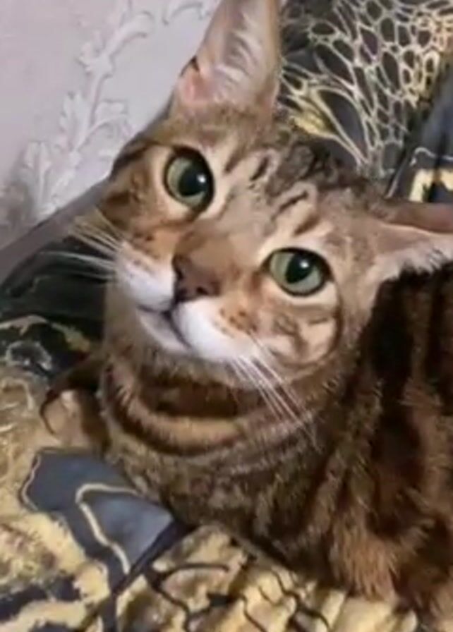 - "Bengal cat sitting on a bed with a patterned bedspread and pillow" by FM-dIZzh1, licensed under CC BY 4.0
