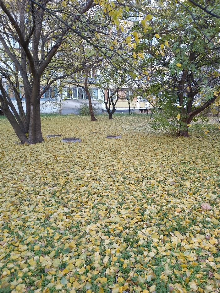 This image displays an autumn residential scene in Kyiv, Ukraine. The ground is thickly covered with fallen yellow and light green deciduous leaves, interspersed with patches of green grass and clover. Several trees with primarily bare branches or sparse yellow-green foliage are distributed across the frame. A large multi-trunked tree stands prominently on the left. In the midground, three square concrete utility covers are visible embedded in the leaf litter. The background features a multi-story residential building characterized by light-colored walls, horizontal banding, and numerous windows, some with white frames and security grilles. Balconies are also present on the building. No individuals, animals, or specific actions are depicted.