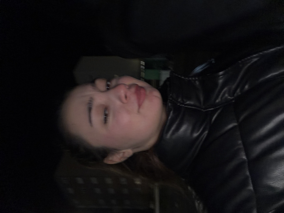 A young woman poses sideways in a dark setting, wearing a shiny, quilted black jacket. The background is mostly obscured by darkness, with faint hints of buildings. Her face is illuminated, showing light skin, brown hair, and a neutral expression. The photo appears to have been taken at night or in low light conditions. The camera angle is slightly tilted.