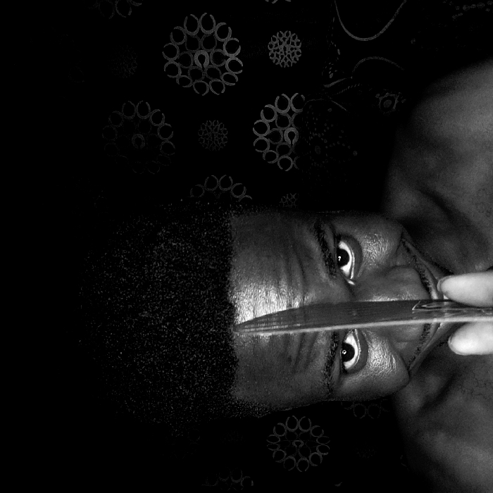 A black and white, close-up image depicts a male subject in an indoor location within Narayi, Nigeria. The individual, appearing shirtless with dark, short textured hair, is positioned centrally, looking directly at the camera. A large, reflective knife blade is held vertically in front of his face, obscuring the bridge of his nose and a portion of his forehead. His eyes are open and focused forward, and a subtle smirk is visible. The background is dark, adorned with faded circular patterns composed of interconnected loops. Strong frontal lighting illuminates the subject's face and the knife's surface.