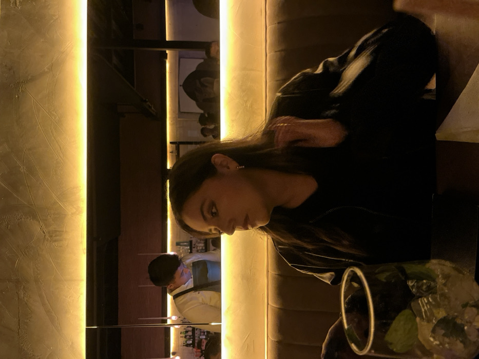 A young woman sits at a dimly lit bar