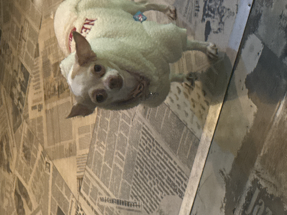 A small, short-haired dog, appearing to be a Chihuahua, stands centrally in the frame, directly facing the viewer. The dog possesses white and light brown coloration on its head and ears, with dark, round eyes and erect, pointed ears. It wears a pale yellow, long-sleeved, fluffy garment that covers most of its body, displaying partially visible red text ("NE") on its upper back and a small blue tag near its right shoulder. A textured collar with a small metallic charm is visible around its neck, beneath the coat. The dog is positioned on a floor surface patterned with overlapping sections of text and imagery resembling newspaper pages, some of which feature non-Latin script, while others contain Latin characters. A distinct horizontal metallic strip divides this patterned floor from a darker, reflective surface in the immediate foreground, showing blurred reflections of the dog's legs and the environment. The scene is located in Yambol, Bulgaria.