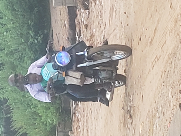 The image captures an adult male and a young child riding a dark-colored motorcycle on an unpaved dirt road in Zango-ndaji, Nigeria