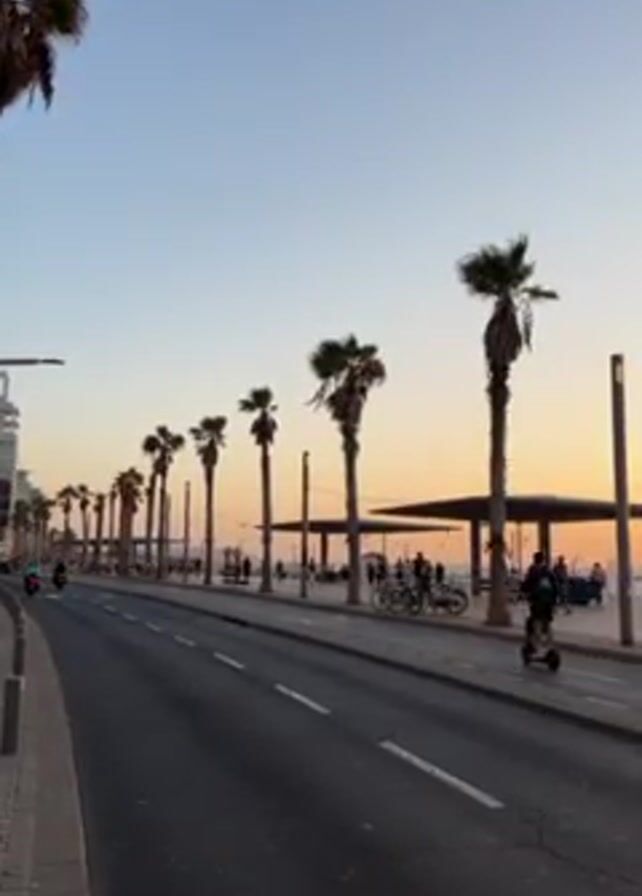The video captures a scene from an urban seaside promenade at dusk. A straight road runs parallel to the beach, lined with tall palm trees on the beach side. People are walking, biking, and congregating on the promenade, some standing beneath shaded structures. Cars are moving along the road, including a white taxi with the word "Gett" displayed on it. The sky is transitioning from a light blue to orange as the sun sets on the horizon.