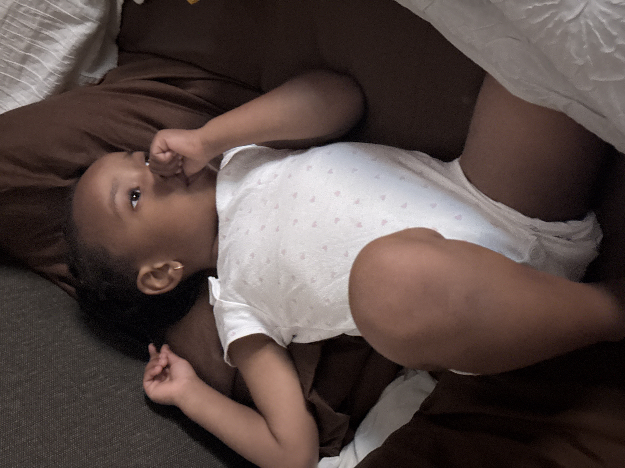An infant of indeterminate gender is observed lying supine on soft furnishings within an indoor residential setting in Alaguntan, Nigeria. The child has dark skin and short, dark hair, with a small gold hoop earring visible in the left ear. The individual is dressed in a white short-sleeved onesie adorned with small pink heart patterns. The left arm is extended above the head, while the right hand has fingers positioned near the mouth. The legs are bent, with the knees elevated. The gaze is directed towards the upper right of the frame. The immediate environment consists of a textured grey fabric surface to the left, and various brown fabrics, likely cushions or blankets, surrounding the child. A rumpled white fabric, possibly a sheet, is visible in the lower right portion of the scene.