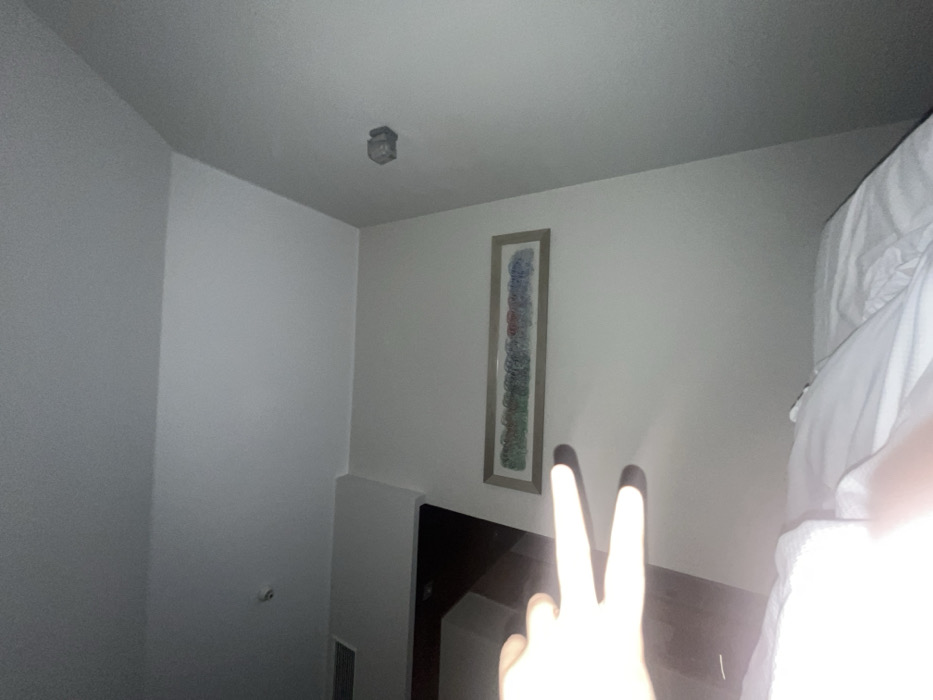 The image displays an interior room in Segrate, Italy, characterized by light-colored walls and a white ceiling. In the lower-left foreground, a human left hand is extended, forming a two-finger 'peace' or 'victory' gesture, which casts a defined two-fingered shadow onto the wall to its right. Centered on the wall is a rectangular framed artwork, approximately horizontal, containing multicolored abstract horizontal lines or strokes. A square, light-colored, wall-mounted fixture is positioned in the upper-right corner of the room. In the upper-left section, a rectangular air vent is installed on the wall below the ceiling line, and a small, circular smoke detector or sensor is affixed to the ceiling. A dark opening, indicative of a doorway or passage, is partially visible on the far left edge of the frame. White bedding, including a pillow and sheet, is present in the lower foreground, suggesting the perspective is from a bed.