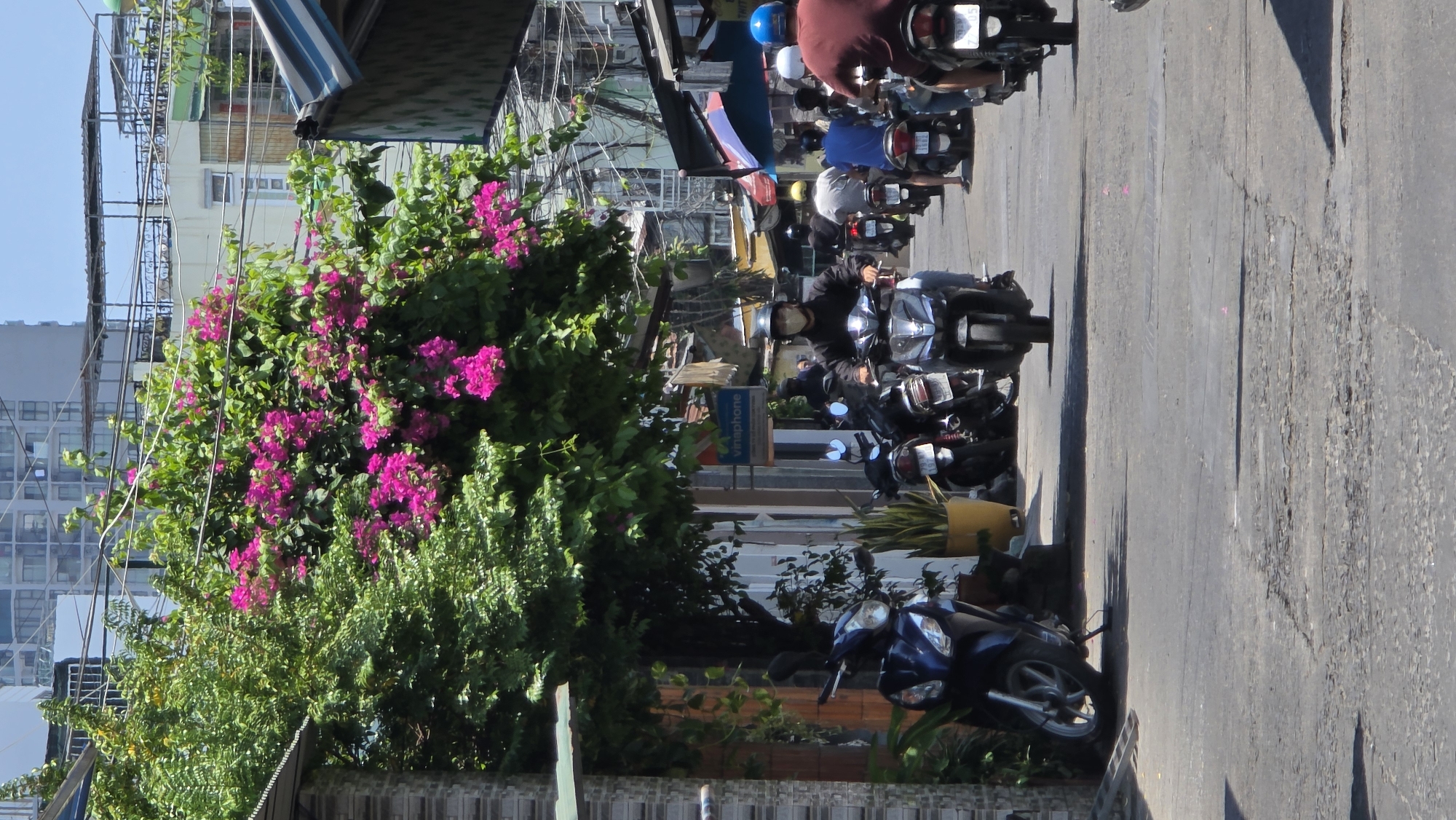 Captured in Tây Nha Trang, Vietnam, the image depicts a narrow, sunlit street teeming with parked and moving motorbikes. A vibrant bougainvillea bush with magenta flowers dominates the left side of the frame, partially obscuring buildings and urban structures. Motorbikes, densely packed, line the street, with several riders visible, some wearing helmets and masks. A Viettel mobile phone sign is visible along the street. The street surface is aged and shows signs of wear and tear. Buildings and overhead wires are visible in the background.