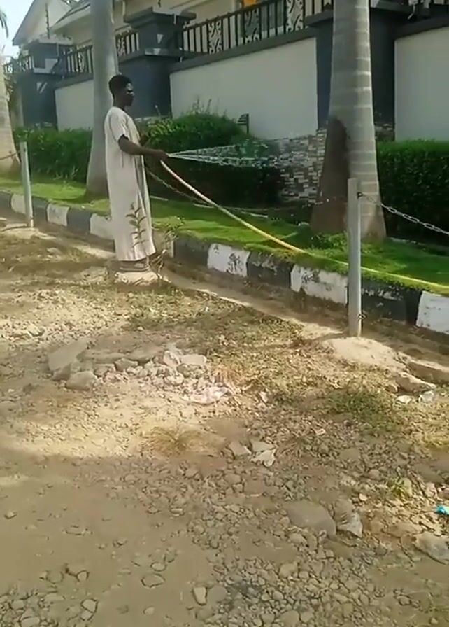 A person wearing a light-colored robe and a mask is watering the lawn along the front of a large, multi-story house with a dark gray roof. The house has a white wall with a black wrought iron fence on top, as well as palm trees and neatly trimmed green bushes. The ground is dirt and gravel, with some grass near the curb. The curb is painted with alternating black and white stripes, and thin metal posts with chains are placed along the lawn. The camera pans to the right after the person walks out of frame, showing the landscaping in more detail.