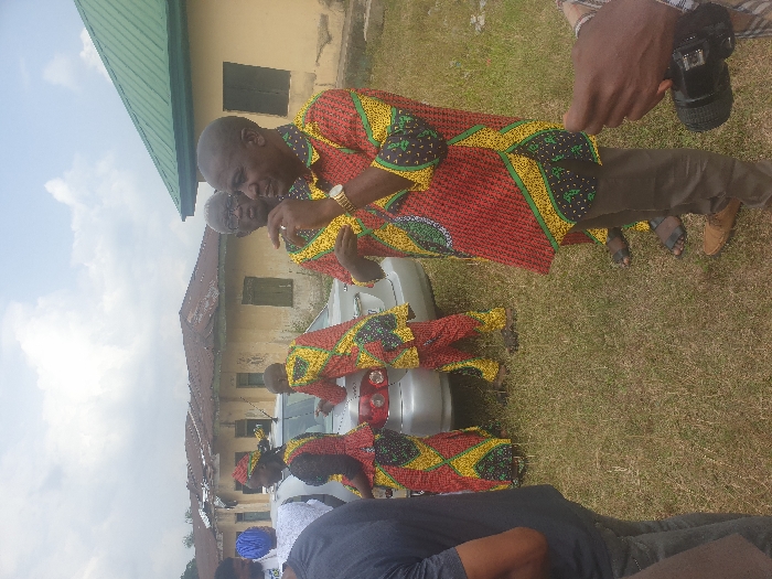 A group of people in colorful patterned shirts stand outside a building. Some individuals are bent over, interacting with a silver car. A man in the forefront wears a watch and gestures with his right hand. Another person holds a camera in the background. Green grass covers the ground. The building behind the group has a green roof and faded walls. The sky is visible in the background.