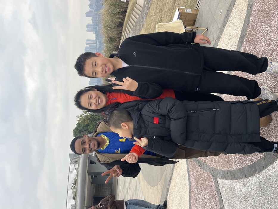 Four individuals, consisting of one adult male, one adult female, and two young boys, are positioned centrally in an outdoor setting, appearing to pose for a photograph. The scene is located in Banan, China, likely in an urban park or promenade overlooking a cityscape. The adult male, on the far left, has dark skin, short dark hair, a beard, and a mustache. He wears a blue and yellow jersey under an open brown jacket and brown trousers, smiling while making a peace sign with his left hand. The adult female, central, appears East Asian, with dark hair pulled back. She wears a red jacket, is smiling, and has her right arm resting on the shoulder of the boy to her right. To the left of the adult female is a young East Asian boy wearing a long black puffer coat featuring a red patch with a yellow star and four smaller stars (Chinese flag) on the left chest. He is smiling, making peace signs with both hands, and looking towards the adult male on his left. To the right of the adult female is another young East Asian boy, wearing a black zip-up fleece jacket and black pants. He is smiling and making a peace sign with his right hand. A fifth individual, an adult male in a brown jacket and blue jeans, is partially visible in the far left background, looking away. The foreground consists of paved ground with reddish-brown and gray interlocking patterns. In the midground, a modern, light-colored elevated structure with a railing is visible on the far left. On the right, steps ascend to a grassy area featuring tall, dried reeds or ornamental grasses. The background reveals a dense skyline of numerous high-rise buildings under an overcast sky. A foldable chair and a cardboard box are situated on the ground to the right of the group.