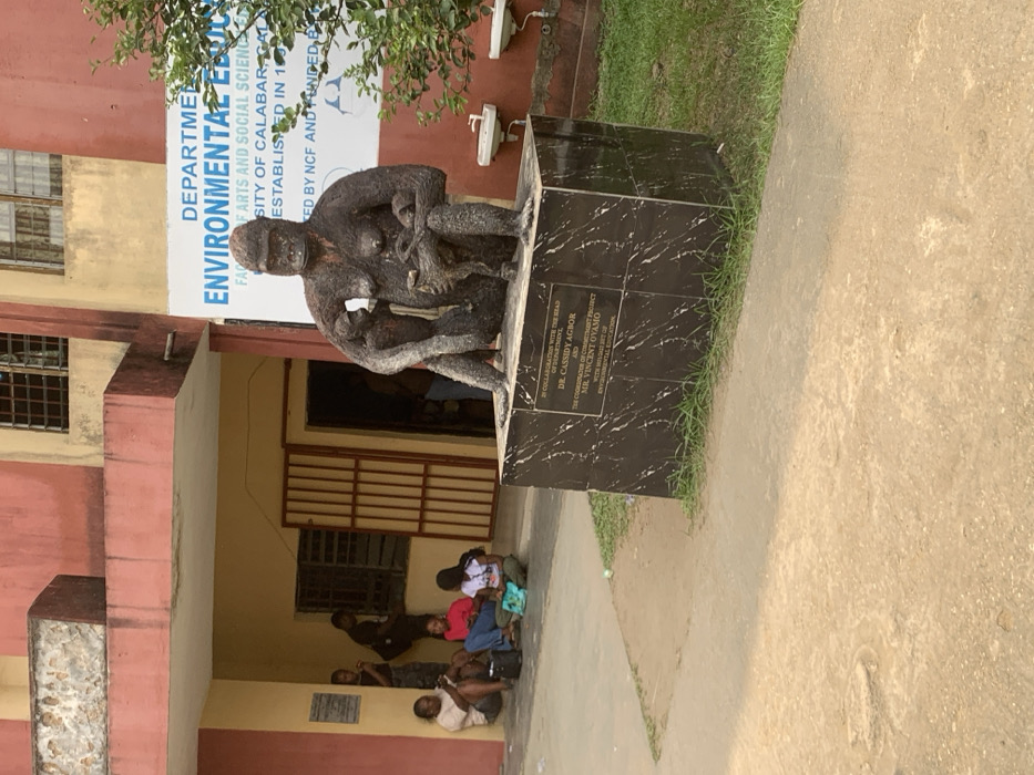 The image displays the exterior of the Department of Environmental Education within the Faculty of Arts and Social Sciences at the University of Calabar, Calabar, Nigeria. A prominent dark, textured statue depicting an adult female gorilla with two juveniles sits centrally on a rectangular pedestal clad in black marble. The pedestal bears an inscription acknowledging "DR. CASSIDY AGBOR" (Head of Department) and "MR. VINCENT OYAMO" (Coordinator of Commitment Project) for their involvement with Environmental Education. Behind the statue is a two-story building featuring a weathered red-orange lower facade and a lighter yellow upper section. A blue and white sign on the wall above the statue identifies the "DEPARTMENT OF ENVIRONMENTAL EDUCATION, FACULTY OF ARTS AND SOCIAL SCIENCES, UNIVERSITY OF CALABAR," with additional partially visible text regarding its establishment and funding. Two white ceramic washbasins are mounted on the wall to the right of the statue. To the left, near the building's main entrance, which has an open metal gate and barred windows, several individuals are present. Four young adults are distinctly visible: two females are seated on the ground, one in a white top and dark pants, the other in a pink top and blue jeans, both operating mobile phones. Another female in a dark top is seated nearby. A male in a dark shirt and camouflage pants stands against the wall, also appearing to use a phone. Other individuals are partially obscured within the shadowed building entrance. The ground surface in the immediate foreground is light-colored and unpaved. A patch of green grass is visible to the right of the statue's base, and a small tree or shrub with green foliage is situated further right.