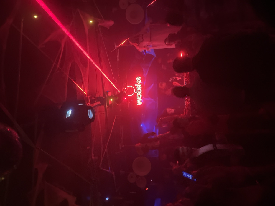 The image captures an indoor event, identified by a prominent neon sign as "watake" with a stylized smiling face icon, likely occurring within a nightclub or similar venue in Valencia, Spain
