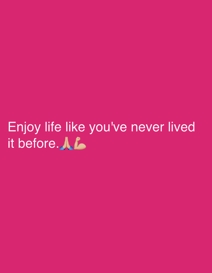 The scene is a digital graphic, located in the city of Strumyani, Bulgaria. The image displays a solid fuchsia background. White, sans-serif text is centered horizontally in the lower portion of the image, reading: "Enjoy life like you've never lived it before." Immediately following this text, on the same line, are two emojis: a pair of folded hands (🙏) and a flexed biceps (💪). No human figures, objects, or environmental elements are depicted beyond the text and emojis on the colored background.