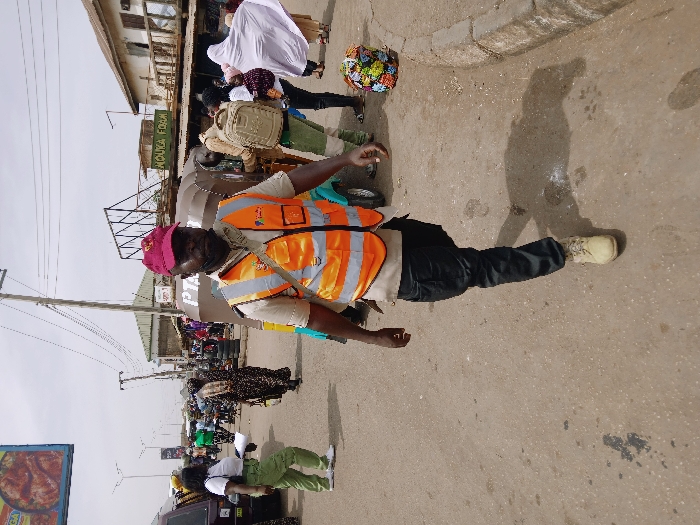 The image depicts a bustling street scene in Kwekwe, Zimbabwe, under bright daylight. A dark-complexioned adult male is positioned in the foreground, walking towards the viewer, slightly right of the center. He wears a maroon baseball cap with a gold emblem, a light-colored short-sleeved shirt, black trousers, and light tan work boots. Over his shirt, he has an orange high-visibility vest with reflective silver strips and a multi-colored logo on the right chest, which includes the text "e-Transport" and a map of Africa. He has a beard and a neutral expression. The background shows an active urban environment. To the immediate left of the main subject, a brown van or small bus is partially visible. Directly behind him, a light blue-green auto-rickshaw (tuk-tuk) is present. Numerous pedestrians populate the scene; on the left, a woman in a white top, light green pants, and white shoes walks away, holding white papers. On the right side, multiple individuals are visible, including one person with a large tan backpack, another holding a child, and an individual clad in a flowing white head covering partially obscuring others. A spherical object, multi-colored with fabric patches, rests on the ground near the right curb. Overhead, power lines are strung across the street, supported by utility poles. Commercial buildings, including a two-story structure with a "MOUKA FOAM" sign, line the street in the midground. An elevated advertising billboard, displaying food items (chicken parts), is visible in the upper left portion of the frame. The paved road surface is worn, exhibiting minor stains and discoloration.