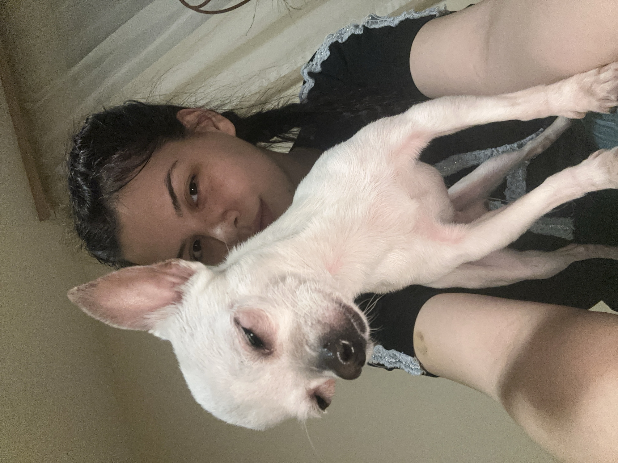 - "A woman with dark hair is lying down with a white dog resting on her chest" by FM-GIf9Q2, licensed under CC BY 4.0