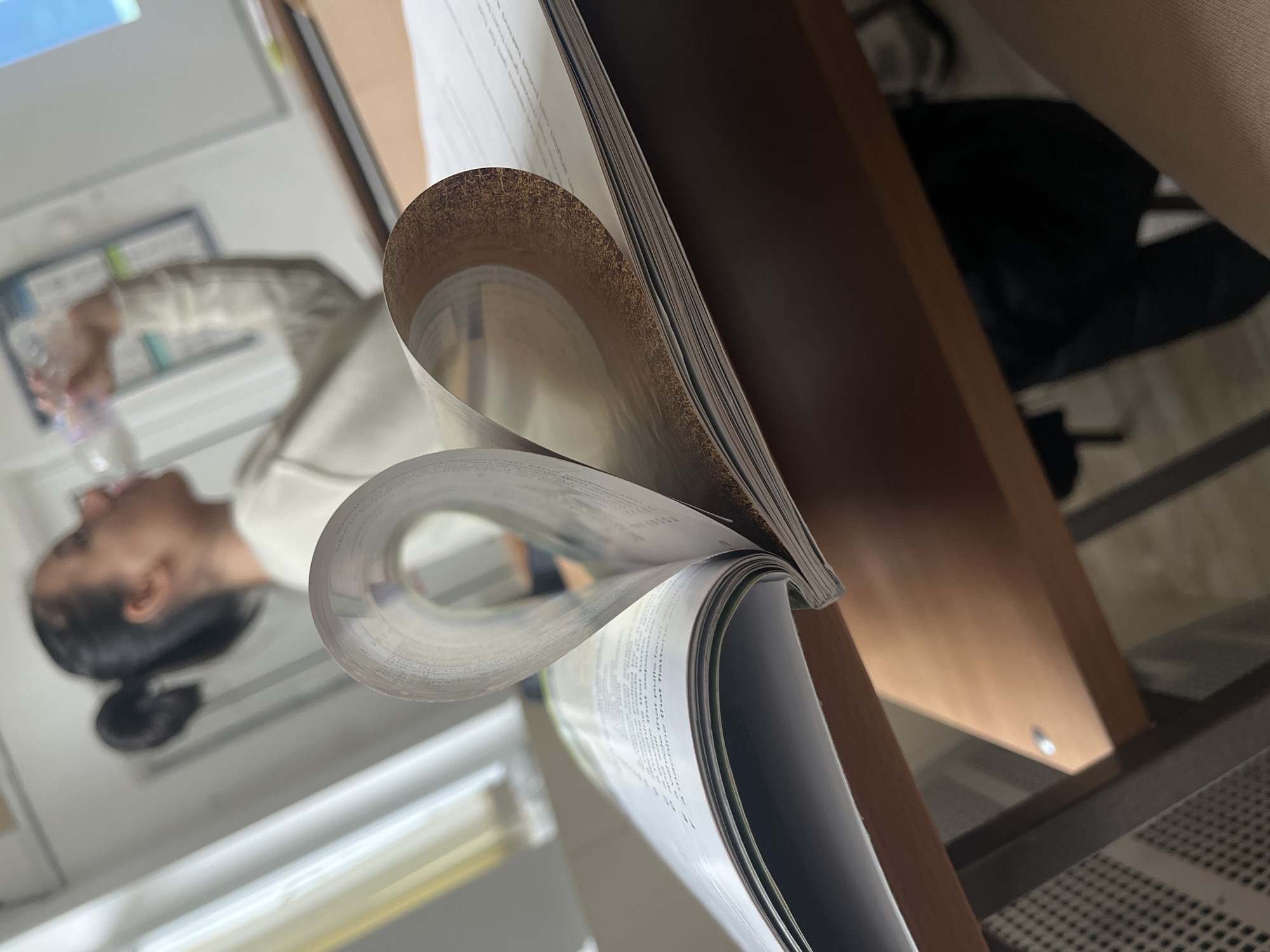 close-up of a book with its pages folded back, creating a looped effect. The book is placed on a wooden surface with a metal grid underneath. In the background, a person is visible, holding a water bottle. The person has dark hair pulled back in a bun. The location cannot be determined from the image.