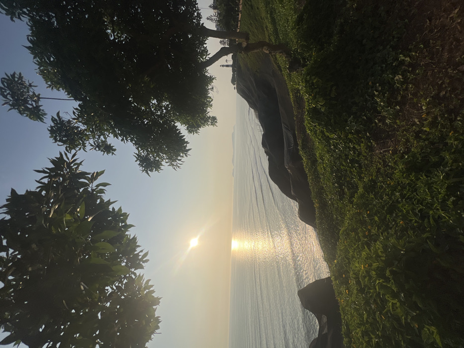 coastal view at sunset. A cliff covered in lush green vegetation rises on the right side of the frame, descending to the ocean. The water reflects the sunlight, creating a shimmering effect. Two trees frame the left side of the image, their branches reaching towards the sky. The sky is a light blue, fading into a hazy yellow near the horizon where the sun is positioned.