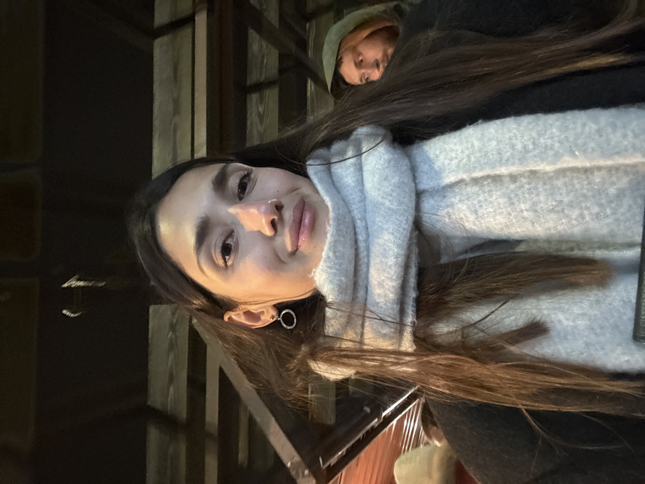 A selfie captures a woman with long, brown hair, wearing a light grey scarf and dark jacket