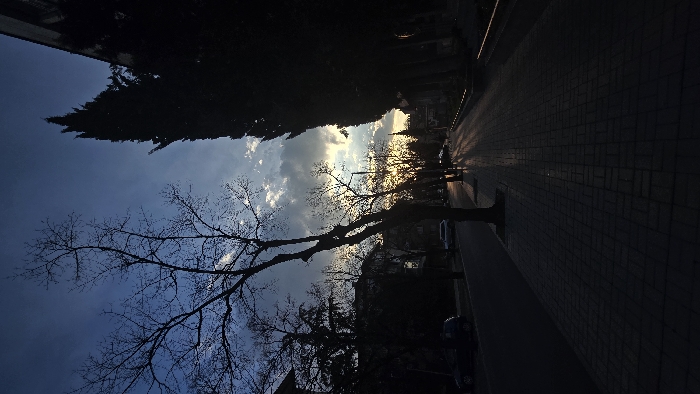 The image depicts an urban street scene in Stara Zagora, Bulgaria, at either dusk or dawn. The primary illumination is from a low sun positioned towards the right side of the frame, casting long shadows and creating a strong backlighting effect. In the foreground, a large, bare deciduous tree with multiple branches is silhouetted prominently on the left. To its right, a paved sidewalk composed of interlocking pavers extends into the distance. On the far right, the dark silhouette of a tall, columnar coniferous tree, likely a cypress, stands alongside a dark building facade. The midground features a street running parallel to the sidewalk on the left. At least two vehicles are parked along this street: a dark compact car is visible in deep shadow in the immediate midground, and a lighter-colored SUV or wagon is parked further down. A series of streetlights are visible lining the sidewalk, with their poles casting long, distinct shadows across the illuminated section of the sidewalk and street. Other bare deciduous trees line both sides of the street. The background shows additional residential or commercial buildings obscured by trees and shadows. The sky transitions from a dark blue overhead to a lighter blue-grey and white directly above the horizon on the right, where the sun's rays penetrate scattered clouds, generating a bright, golden glow. No individuals or specific actions are discernible within the scene.