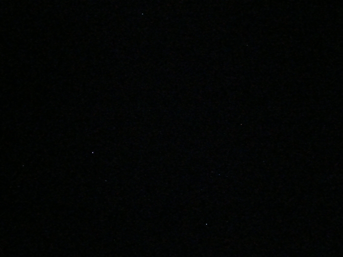 The image is predominantly black, suggesting a night scene or a dark, enclosed space. Sparse, tiny white dots are scattered across the blackness, resembling stars in the night sky. These dots are faint and few in number, emphasizing the overall darkness and vastness of the space. The composition evokes a sense of emptiness and perhaps mystery.