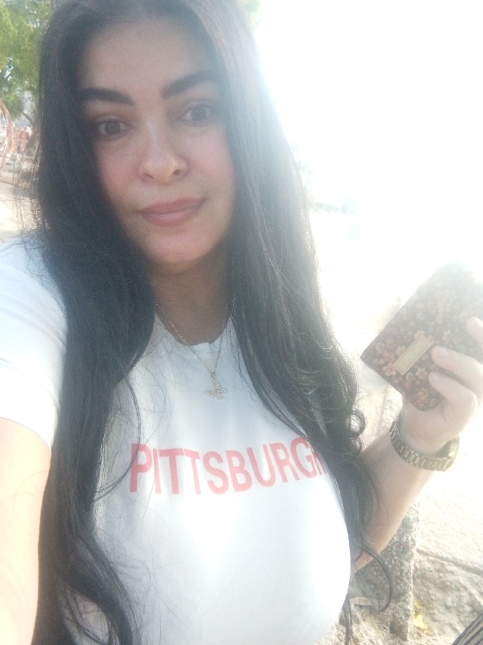 A woman takes a selfie. She has long, dark hair and light skin. She wears a white t-shirt with "PITTSBURGH" printed in red letters. A gold necklace hangs around her neck. She holds a brown wallet with a floral pattern. A gold watch adorns her wrist. The background is bright with sunlight, partially obscuring details.