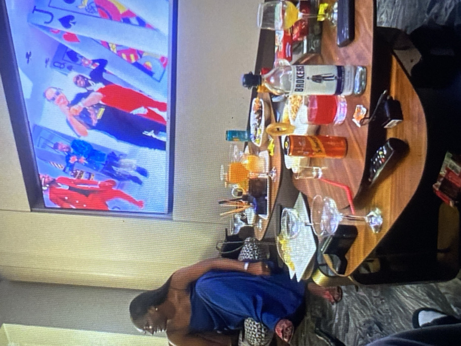 A living space features a round wooden table cluttered with glasses, bottles, and snacks. A bottle of Broker's gin is visible. A woman in a blue dress is crouching near the table, wearing patterned footwear. A television screen displays images of people dressed as playing cards. The overall atmosphere suggests a casual, informal gathering or relaxation in a home environment.